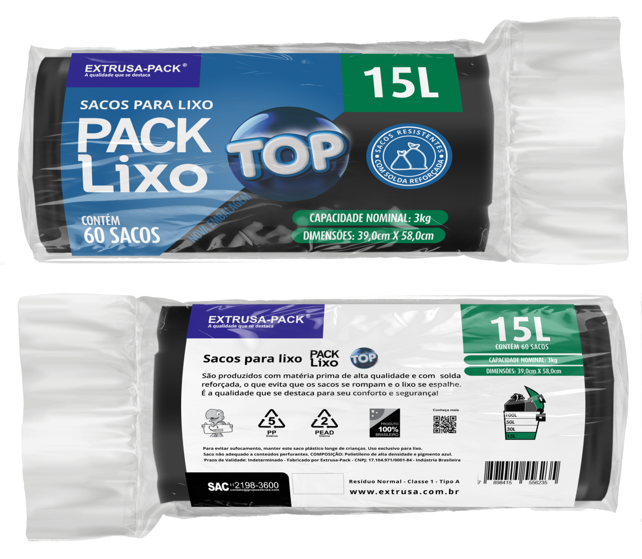 SACO DE LIXO TOP 15 LITROS PRETO (39X58 CM) - FARDO COM 10 ROLOS (60 UND POR ROLO)